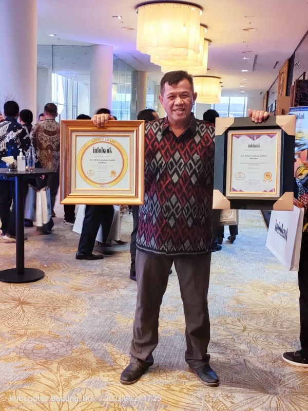 Dirut PT BPR Caruban Indah menunjukkan dua piagam penghargaan Golden Award